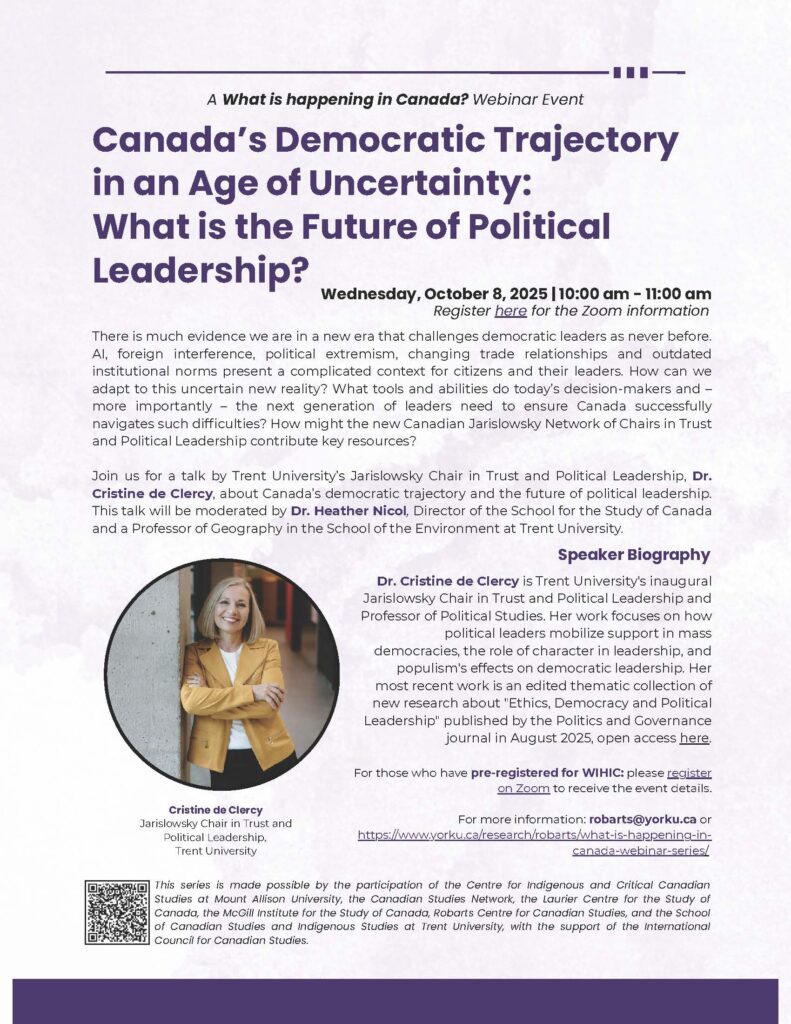 Join us for a talk by Trent University’s Jarislowsky Chair in Trust and Political Leadership, Dr. Cristine de Clercy, about Canada’s democratic trajectory and the future of political leadership. This talk will be moderated by Dr. Heather Nicol, Director of the School for the Study of Canada and a Professor of Geography in the School of the Environment at Trent University.